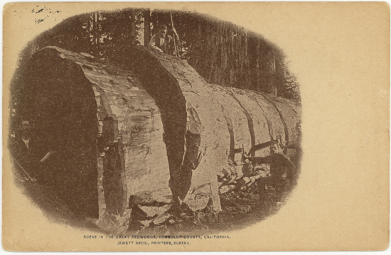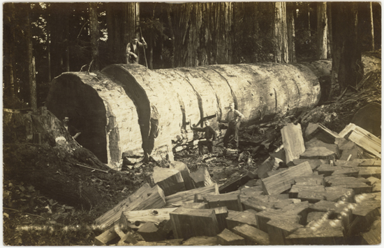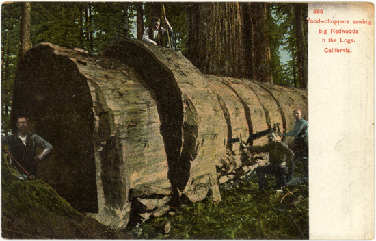 42:116, text på kortet: 366 Wood-choppers sawing big Redwoods n the Logs,